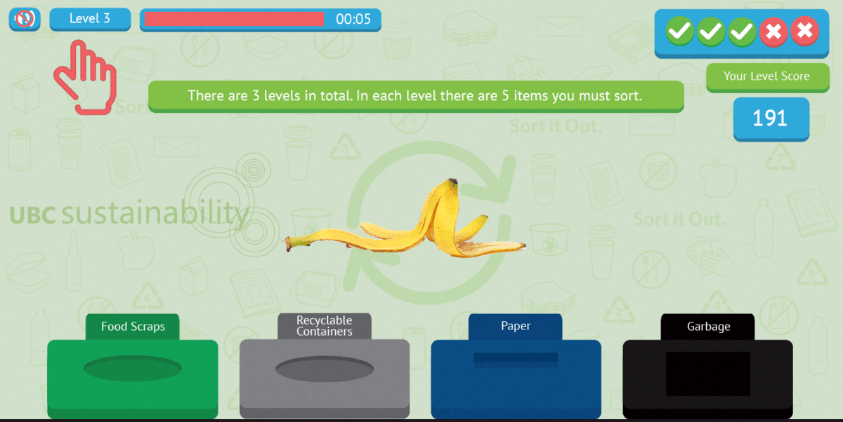 The main purpose of this game is to help faculty, alumni, and current students at UBC learn about our unique sorting system. You may be suprised at how some items need to be sorted. Alongside the goal of educating, this game also will collect data about how users sort common items, helping UBC better understand behaviours and attempt to rectify them through various initiatives.
